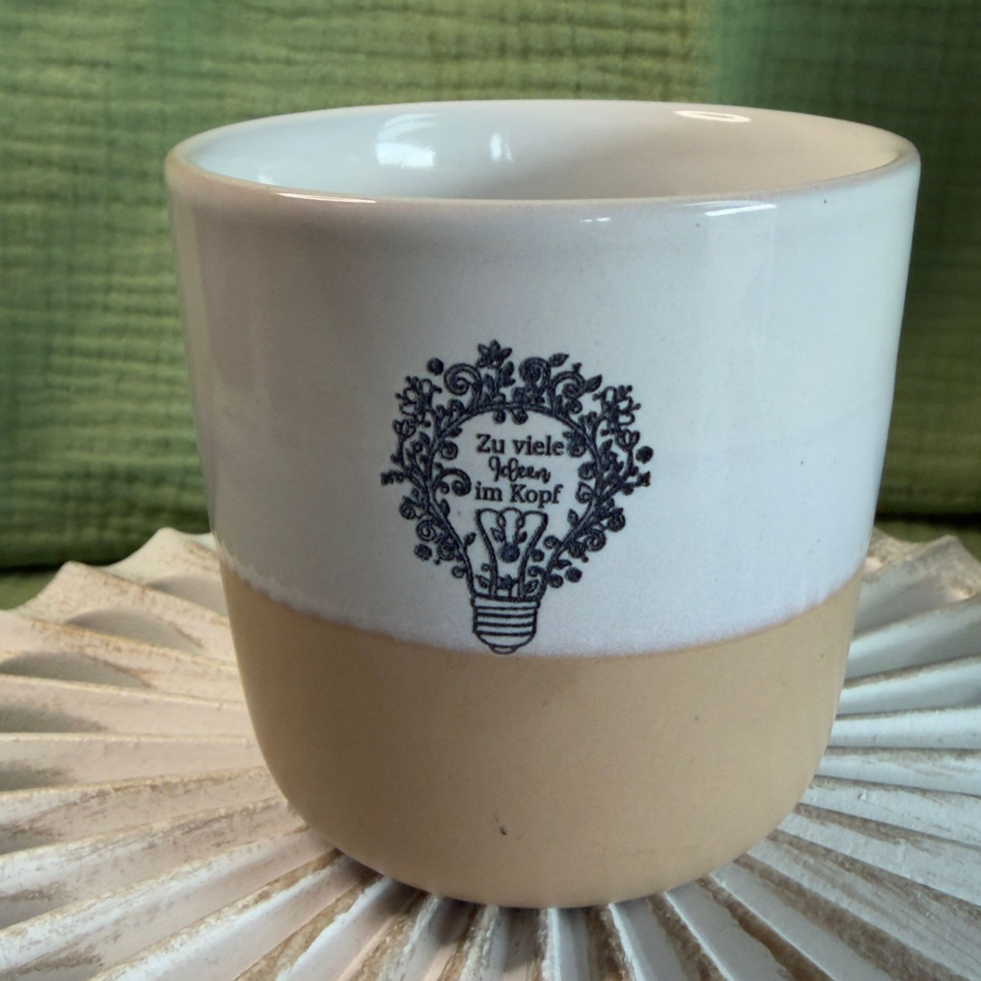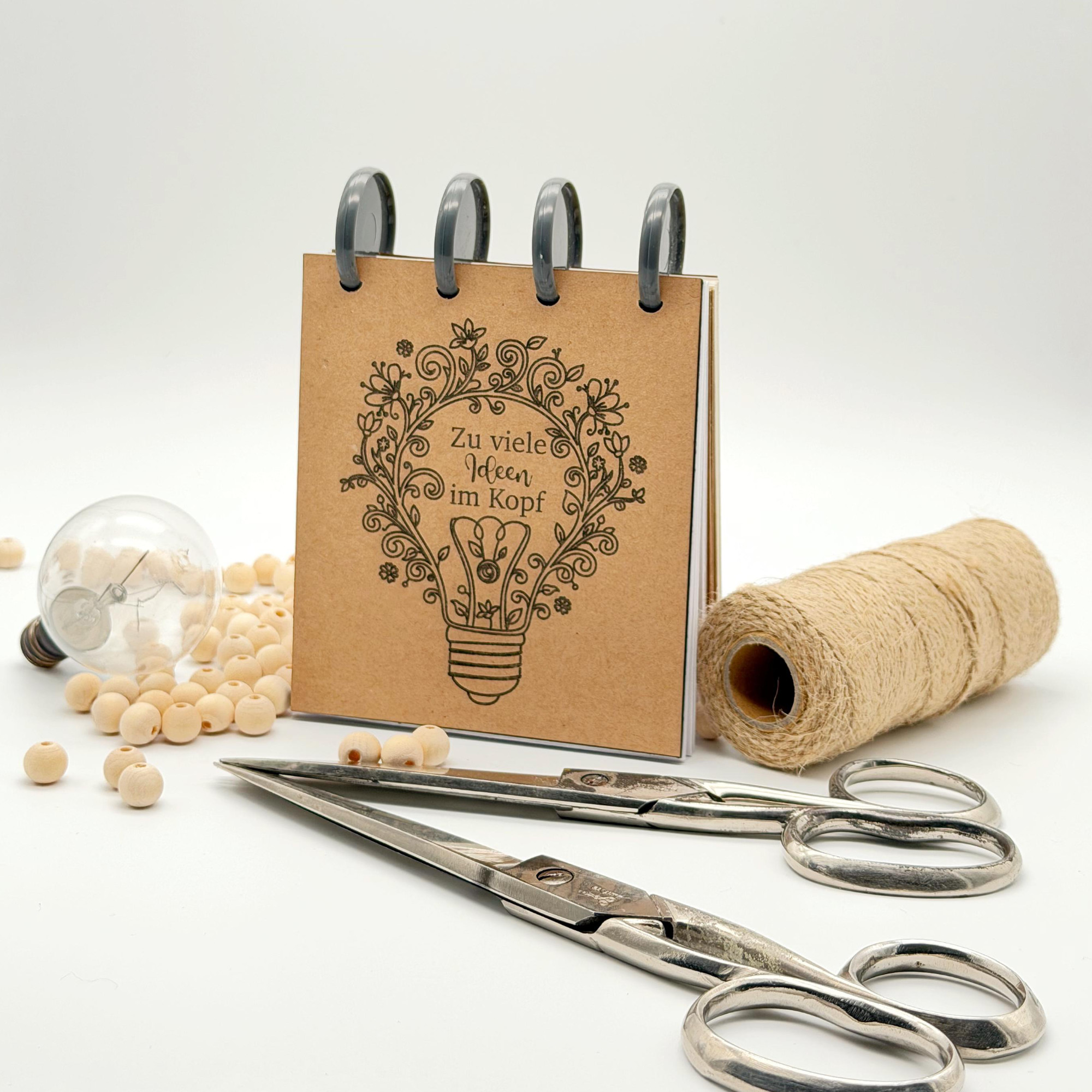 Ideen-Glühbirne: Eine prachtvoll verzierte Glühbirne, die aus Ranken und Blüten besteht, mit dem passenden Spruch „Zu viele Ideen im Kopf“.