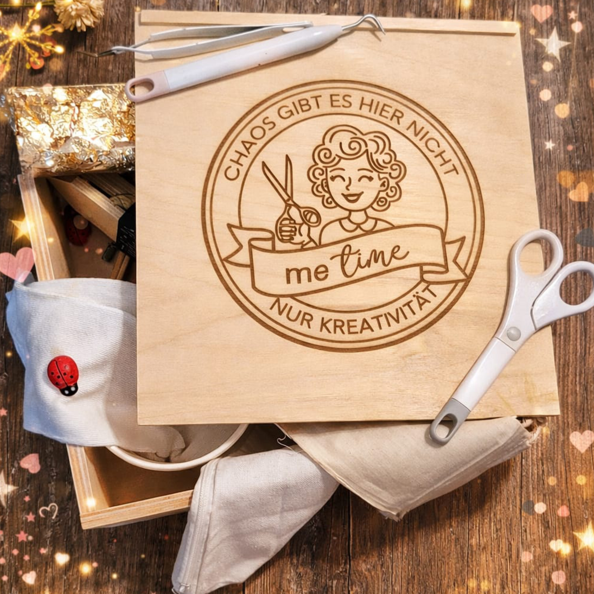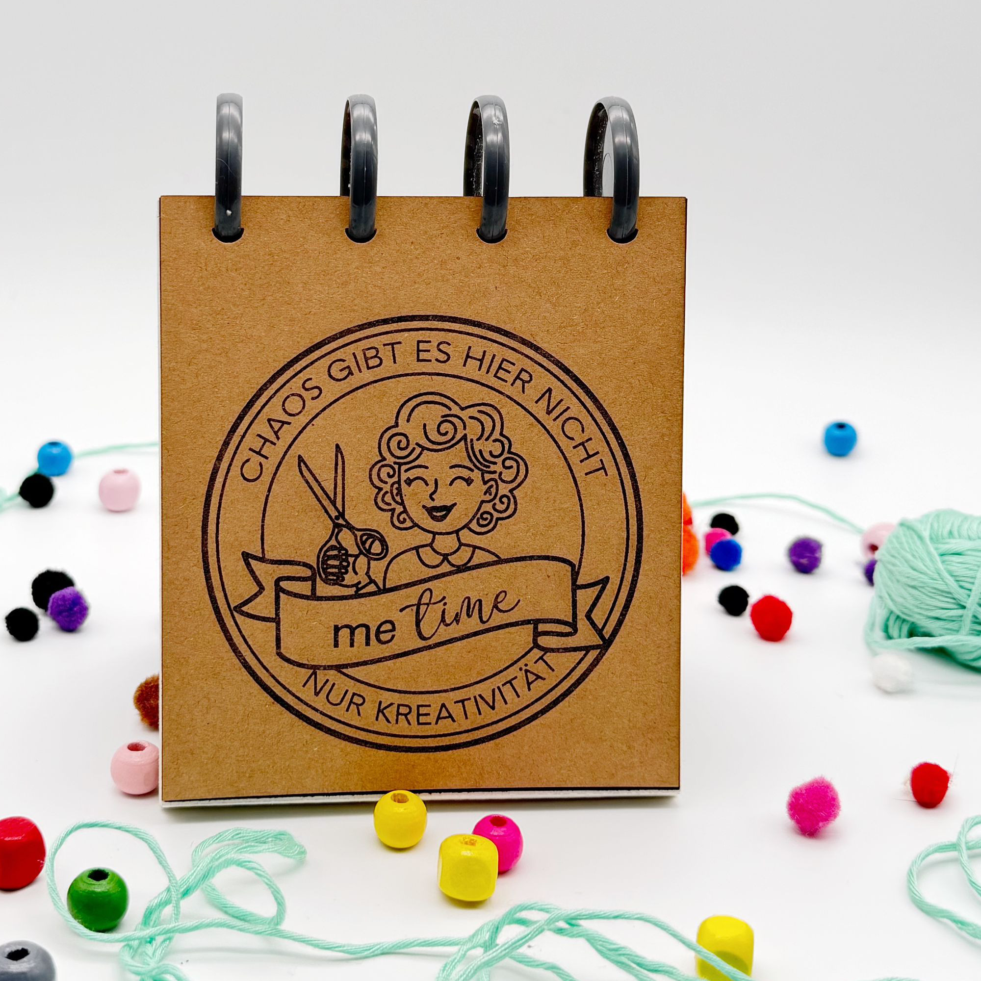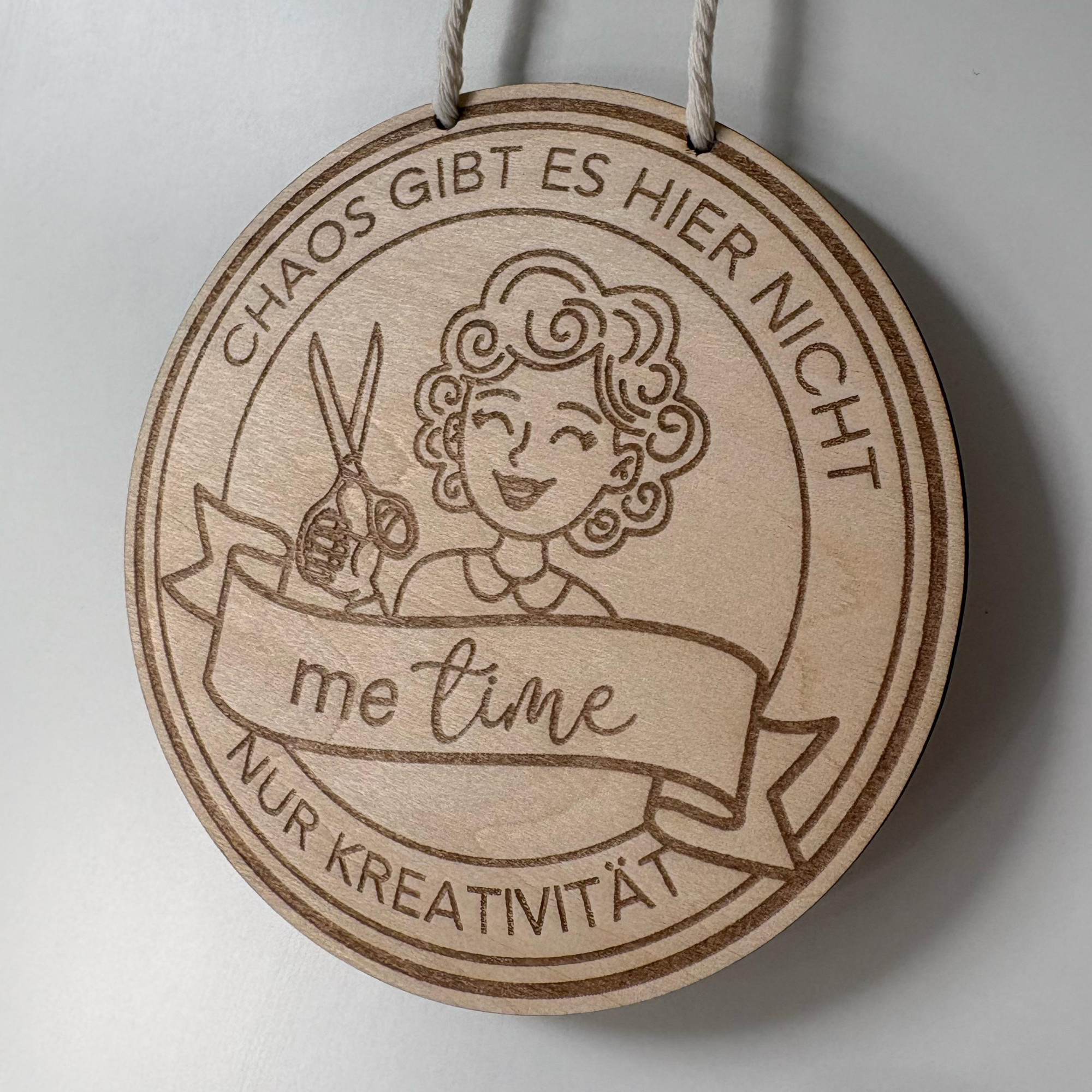 Kreativ-Emblem: Ein kreisrundes Siegel mit einer fröhlichen Bastlerin (mit Schere!), dem Schriftzug „Chaos gibt es hier nicht – nur Kreativität“ und einem Banner für deine persönliche „Me Time“.