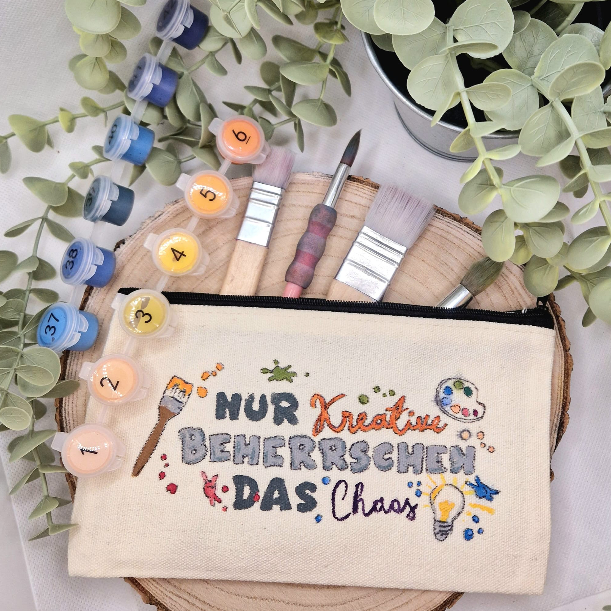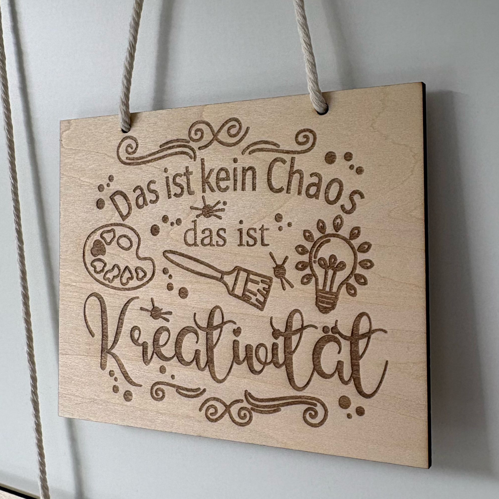 Kreativitäts-Statement: Ein verspieltes Design mit Farbpalette und Pinsel: „Das ist kein Chaos, das ist Kreativität“.