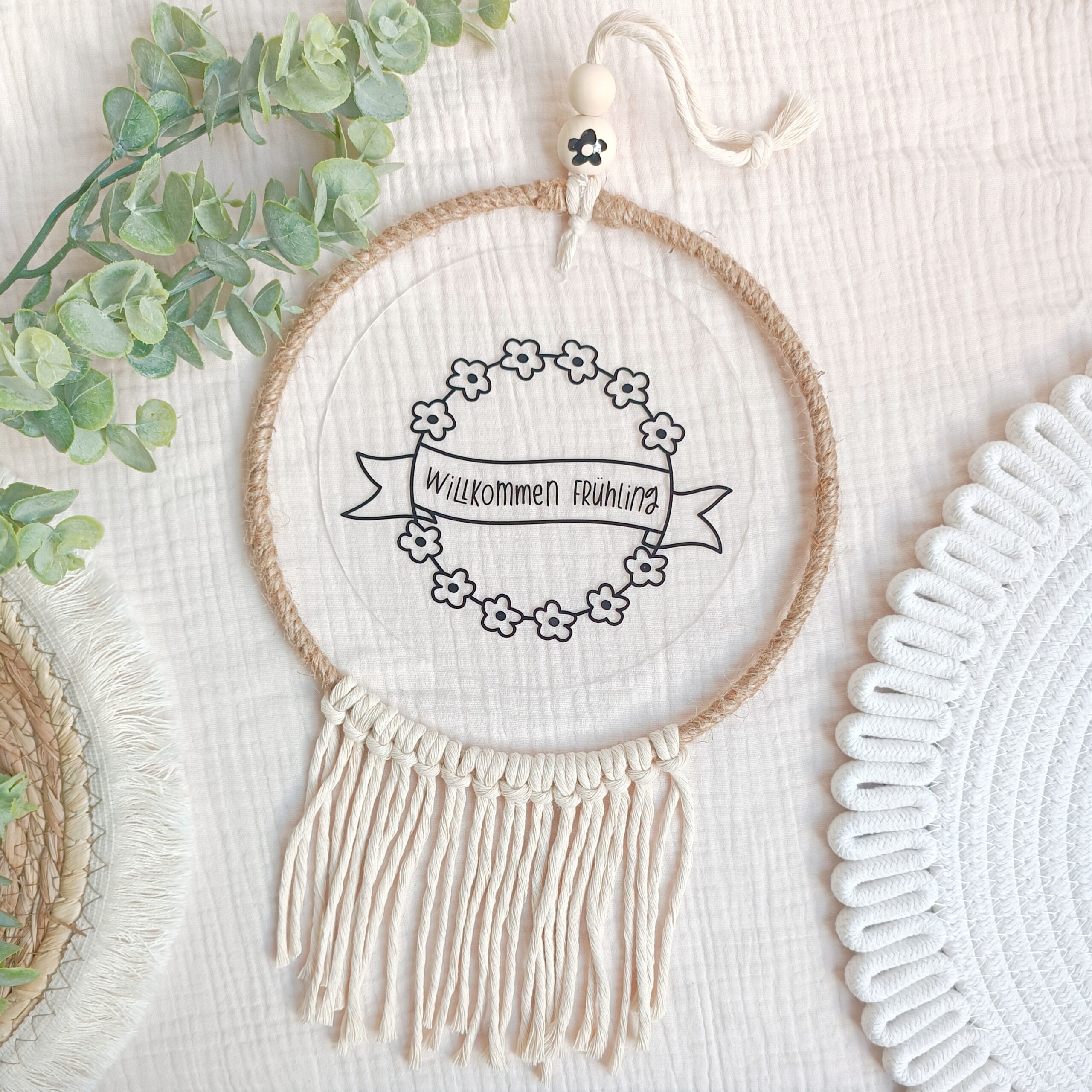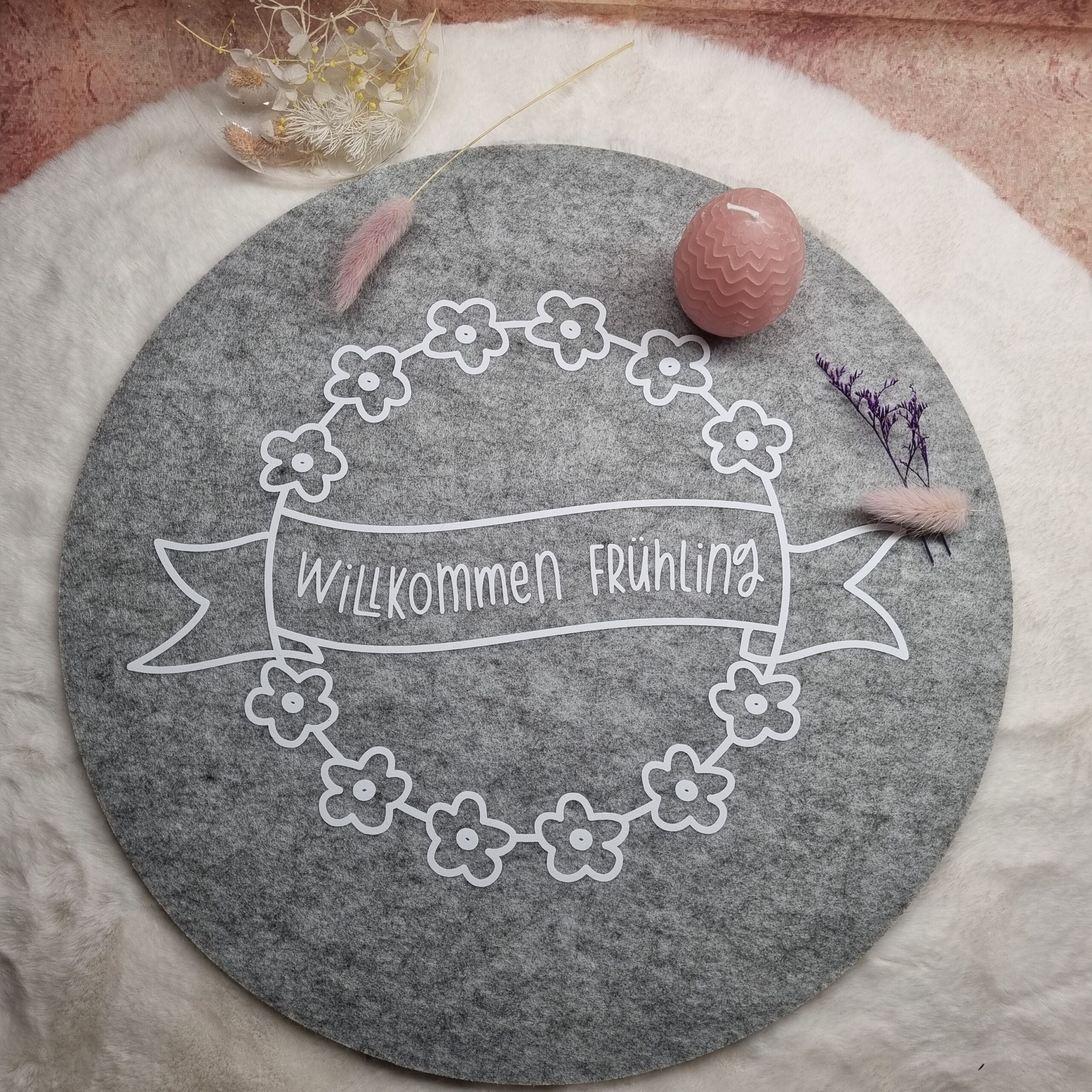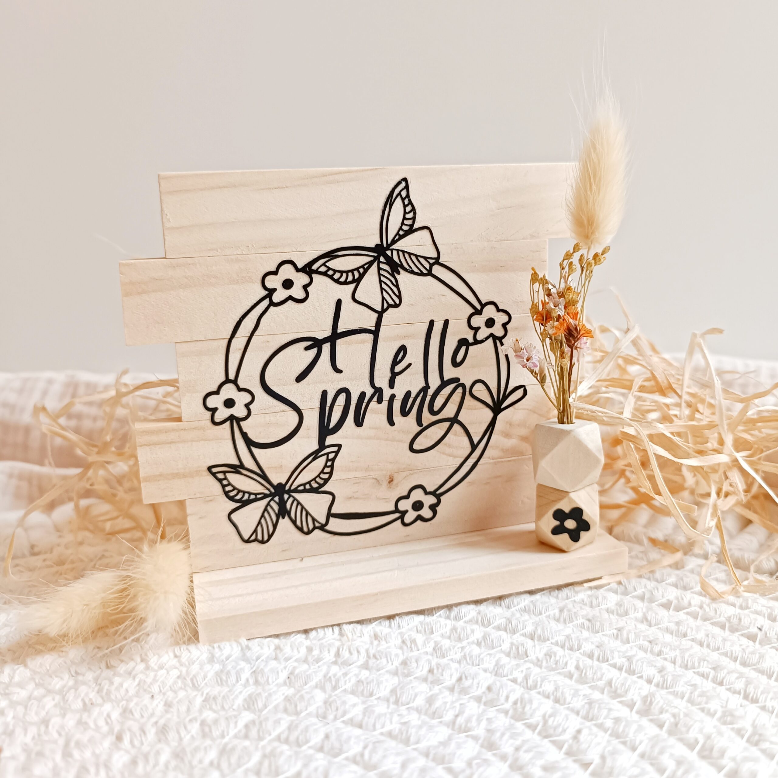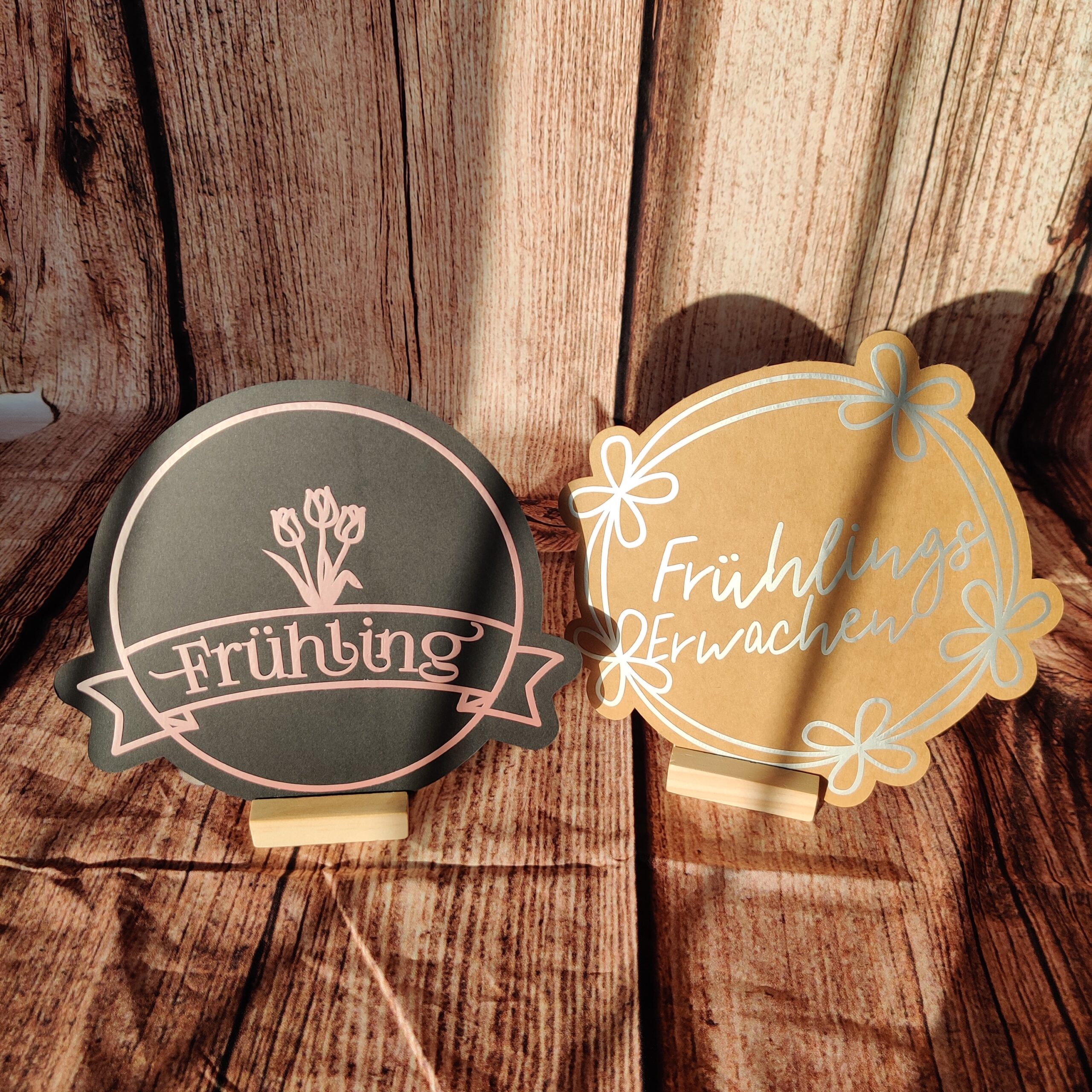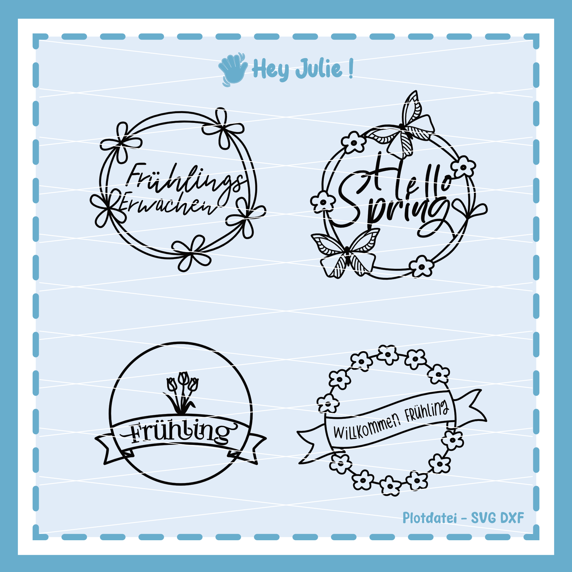 Plotdatei mit vier Frühlings Kränzen, mit Schrift, Blumen und Schmetterlingen.