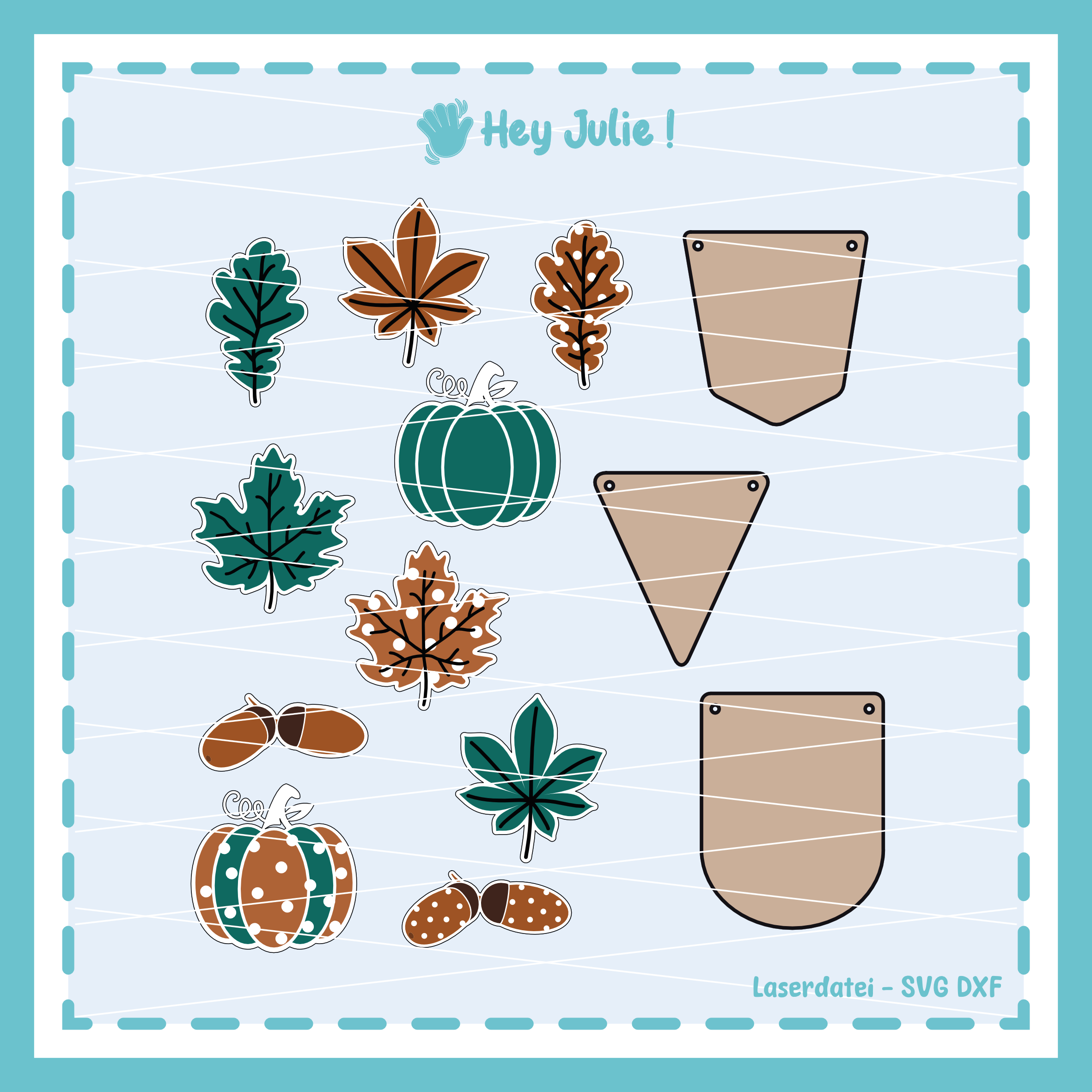 Plottdatei mit verschiedenen Herbstlichen Blätter, Kürbissen und Eicheln. Außerdem beinhaltet sie drei verschiedene Wimpel-Formen für eine Herbstliche Girlande.