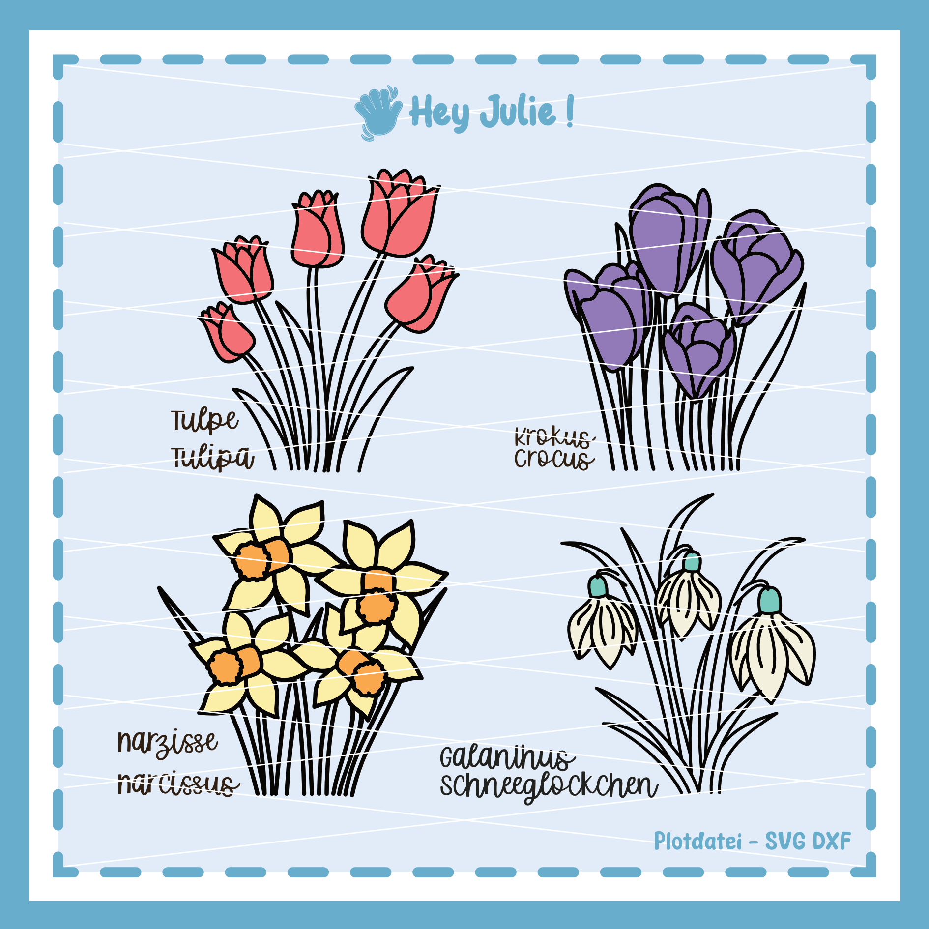 Plotdatei mit vier verschiedenen Blumen. Im zeiten Teil der Plantlover Datei sind die Tulpe, Narzisse, Krokus und Schneeglöckchen mit Ihren Namen in Deutsch und Latein.