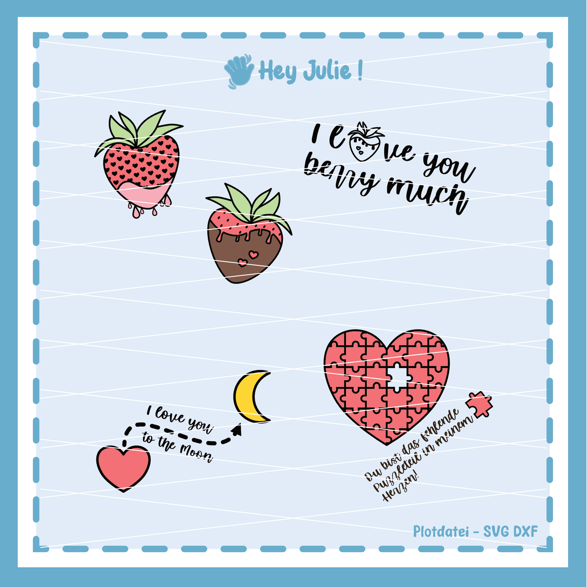 Plotdatei mit Schriftzügen zum Valentinstag, Herzen und Erdbeeren.